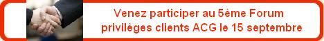 Venez assister à notre 5éme Forum privilège Clients ACG le 15 septembre 2009 à l'hotel Mercure de Mérignac. Comme chaque année, ce forum est l'occasion de venir découvrir les nouveautés des produits Sage, les solutions partenaires et échanger avec les clients présents.